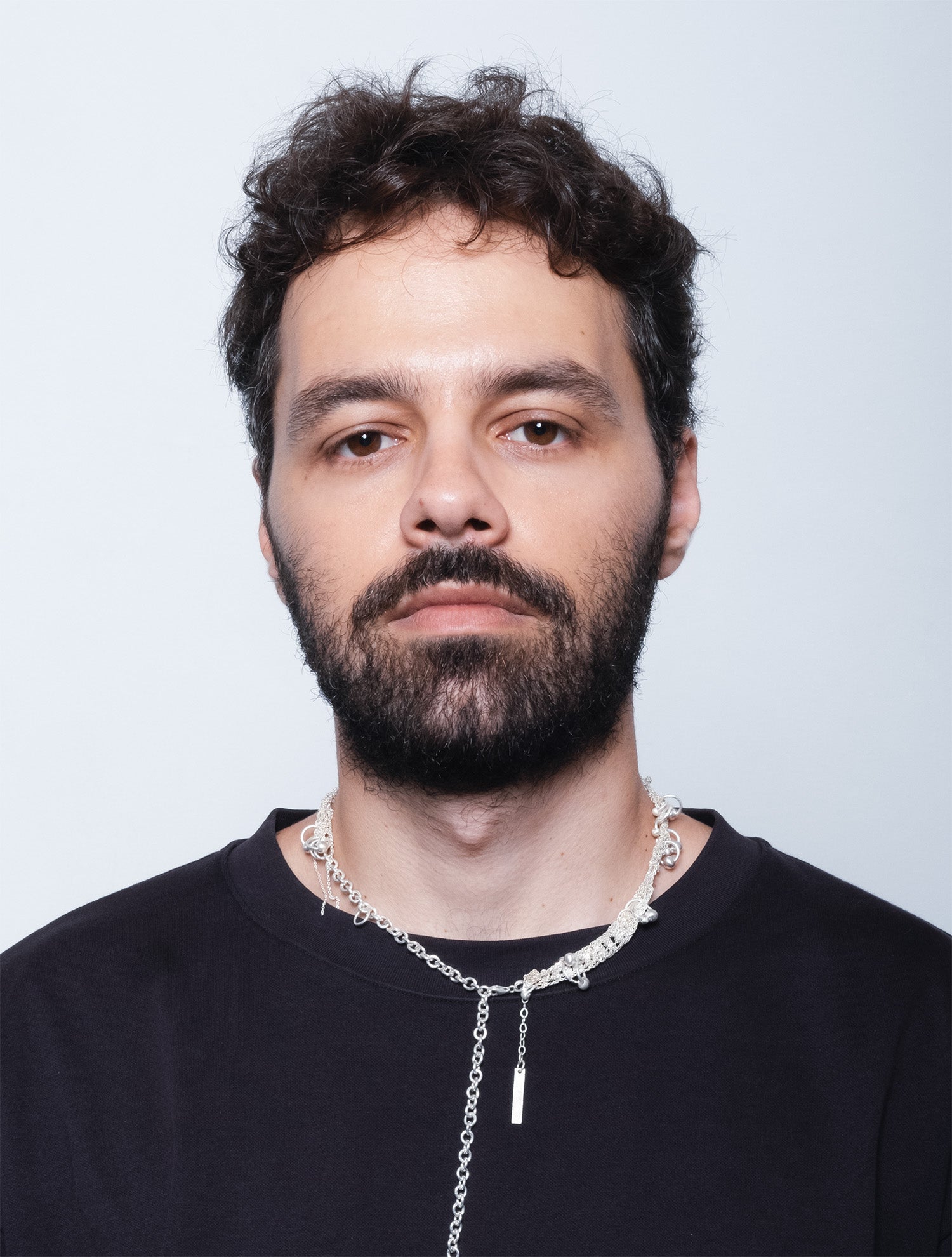 Intended to be worn with the clasp at the front, the composition features a boldly oversized extension chain and a 3D-printed branded silver pendant, both becoming part of the visual statement rather than remaining hidden.