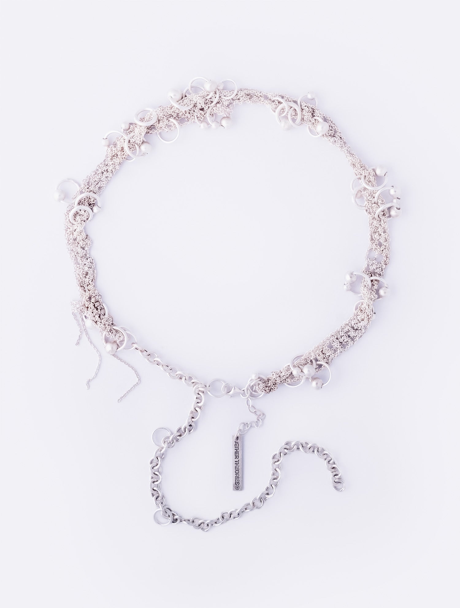 The Frogspawn 2.0 neckpiece continues the tale of organic contradiction, where softness meets structure. Hand-knitted from a classic 1mm 925 silver cable chain, it is embellished with scattered silver pearls and sculptural rings, creating a clustered, glistening texture reminiscent of frogspawn suspended in light.