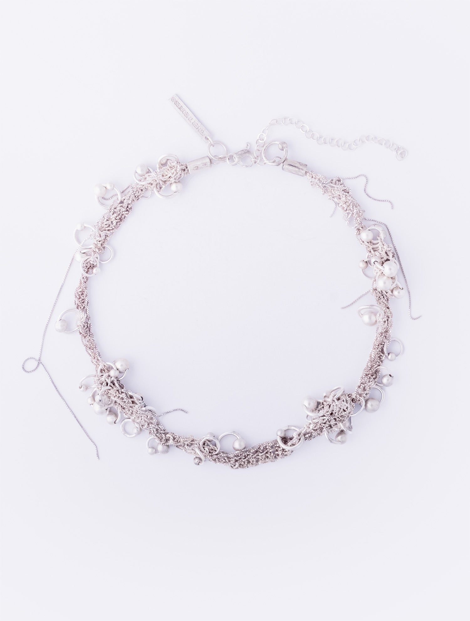 The Frogspawn neckpiece is hand-knitted from 0.8 mm 925 silver box chain using an irregular, intricate stitch technique.