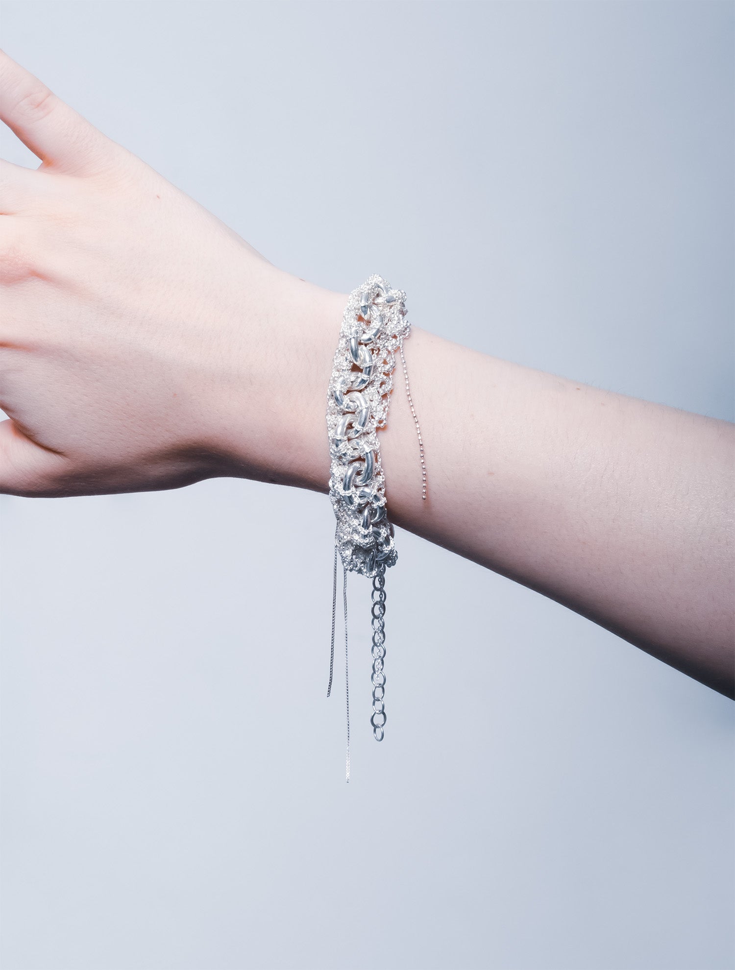 A weighty weave of light and shadow, The Glintroot Bracelet grows like mineral lace,- its silver roots branching across a core of oversized chain.