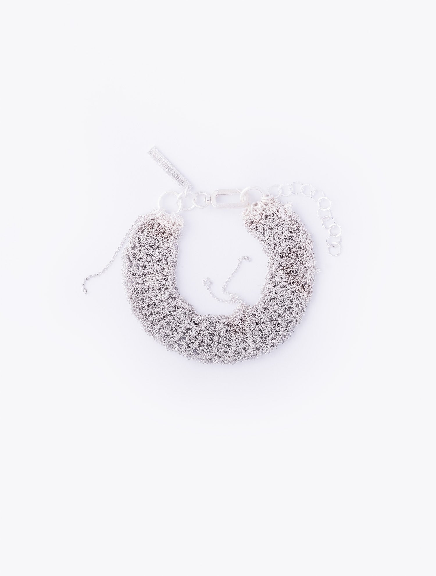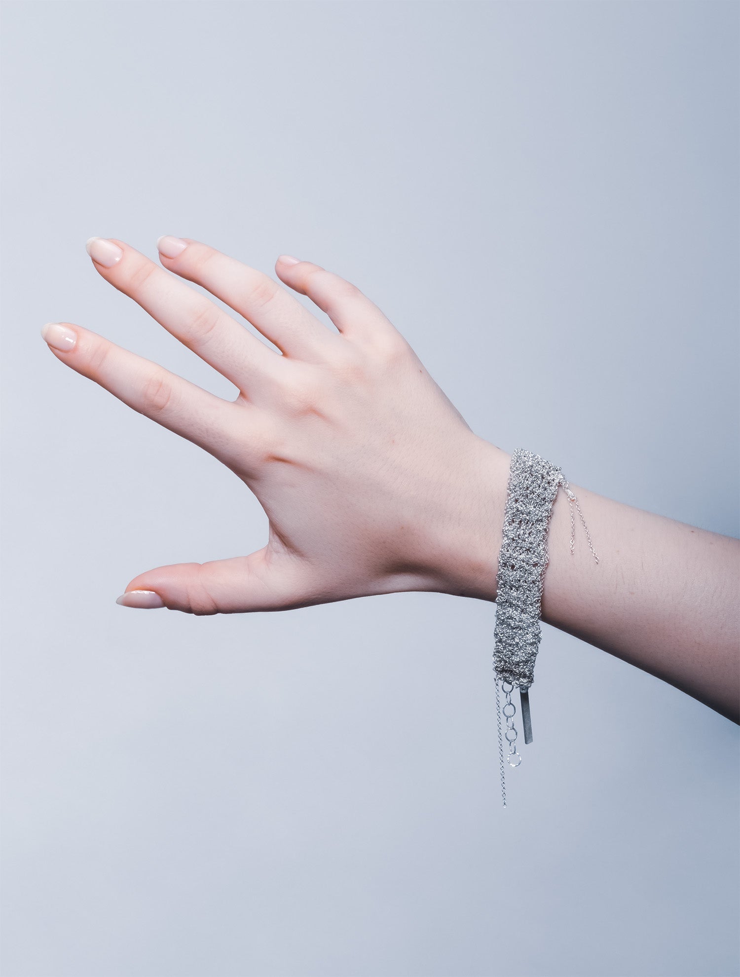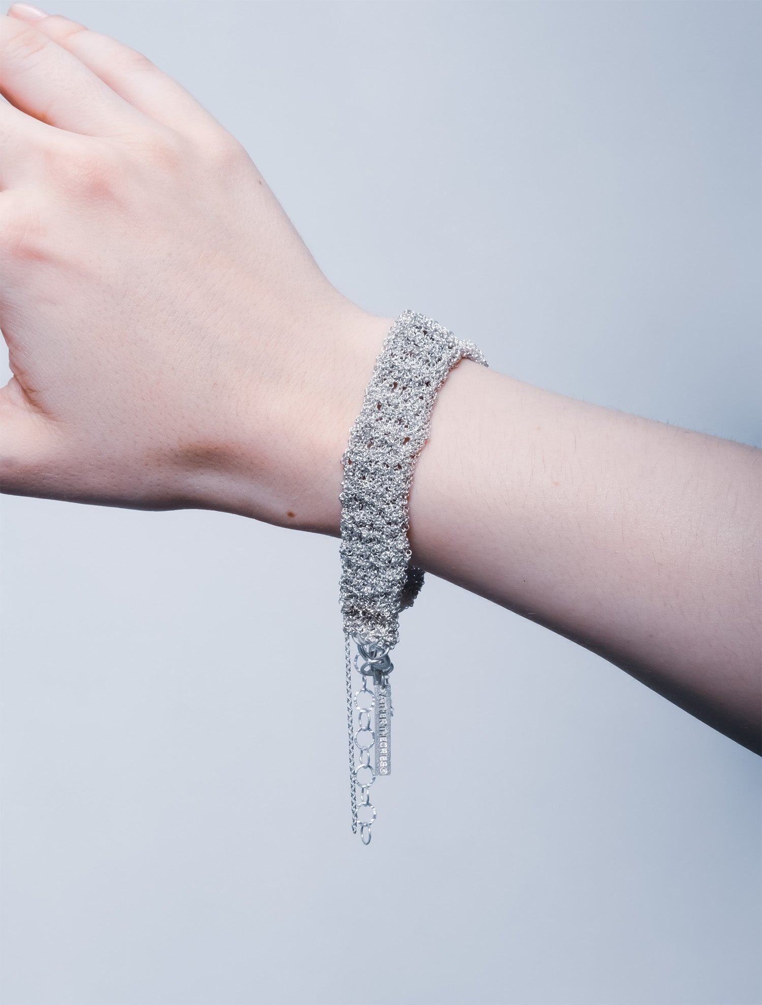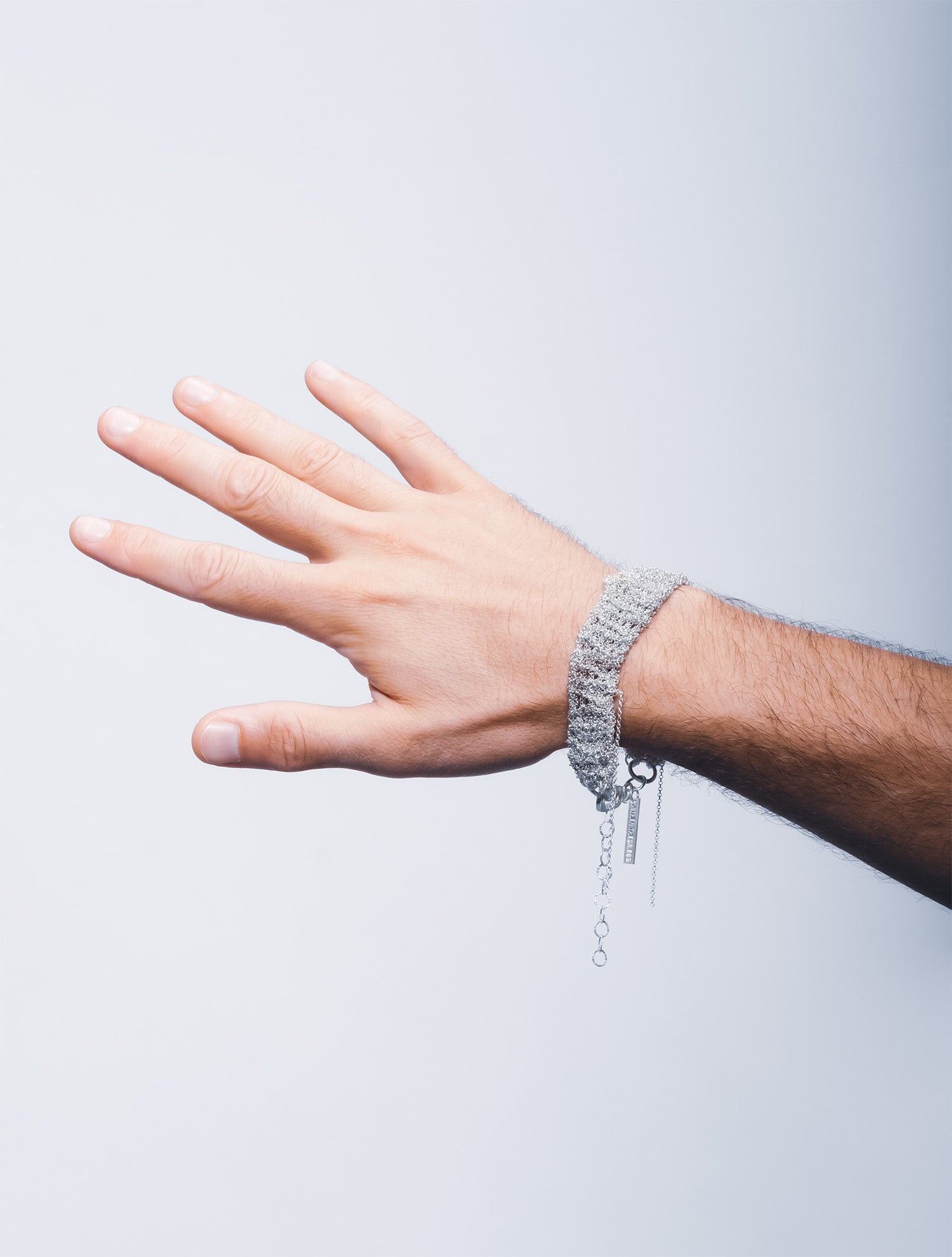 This sculptural bracelet is hand-knitted from 1mm cable chain, forming a voluminous silhouette that wraps the wrist like silver mesh muscle,- heavy, deliberate, and elemental.