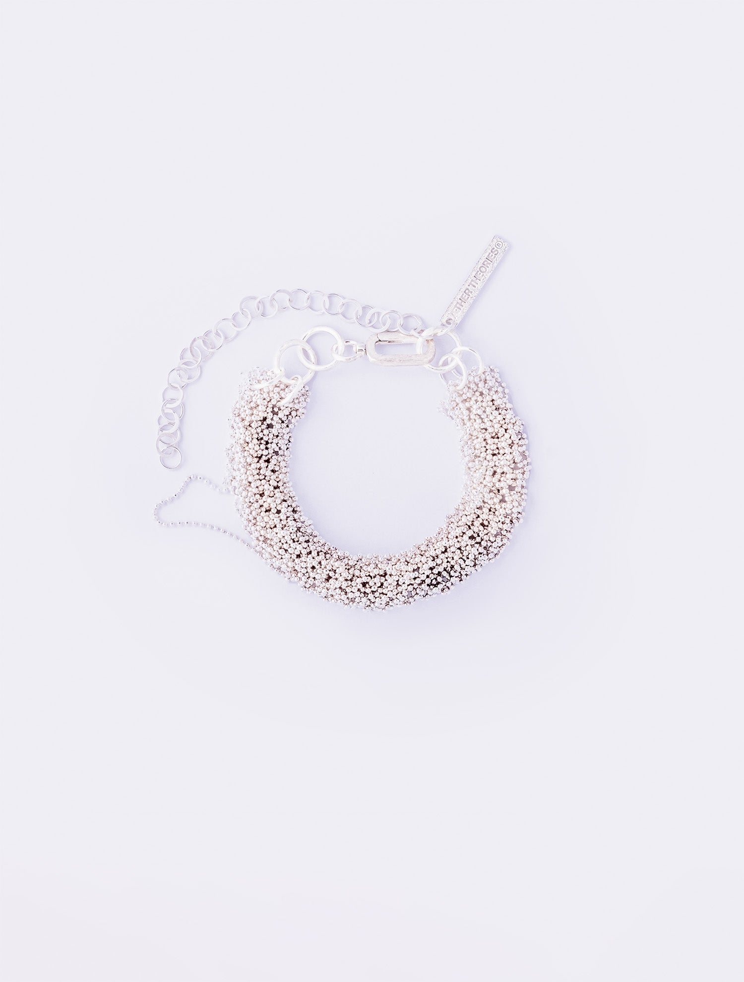 The Moonrun Bracelet is hand-knitted from 925 silver ball chain into a supple, sculptural band that shifts with lunar softness around the wrist.