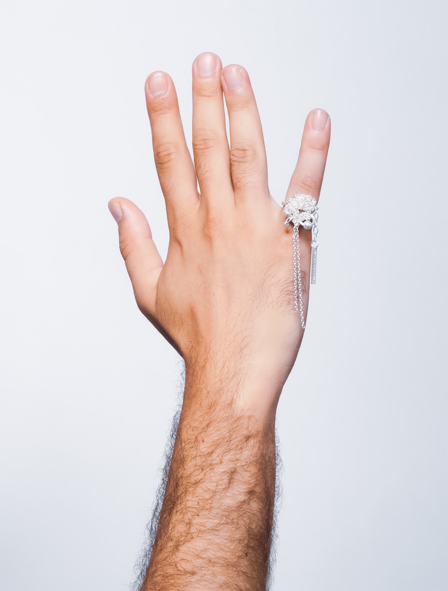 Its 925 silver band anchors a dense knot of handknitted chainwork, where petal-like folds shimmer with soft defiance.