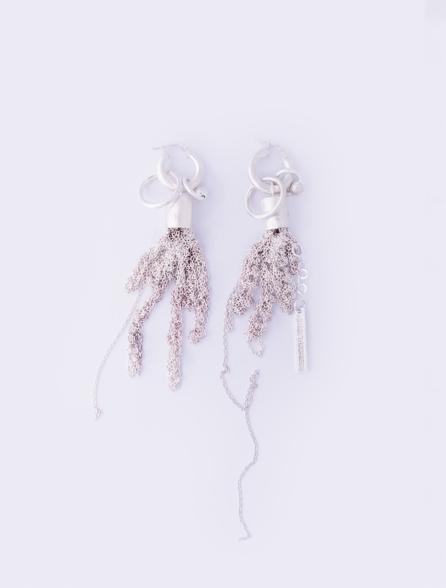 The Wormtide Earrings are composed of an octopus-shaped knitted base made from 0.8mm silver cable chain, secured in tube-like caps and suspended from satin-finished 925 silver hoops.